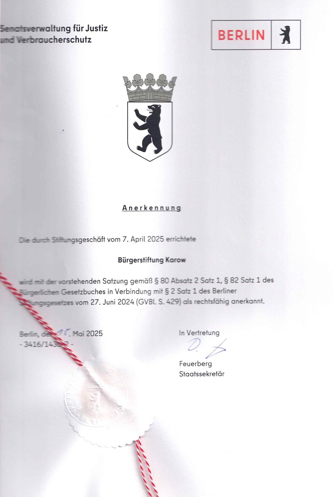 Nach genau 18 Jahren wurde die Treuhandstiftung Bürgerstiftung Karow am 18. Mai von der Berliner Stiftungsaufsicht als selbstständige Stiftung anerkannt.